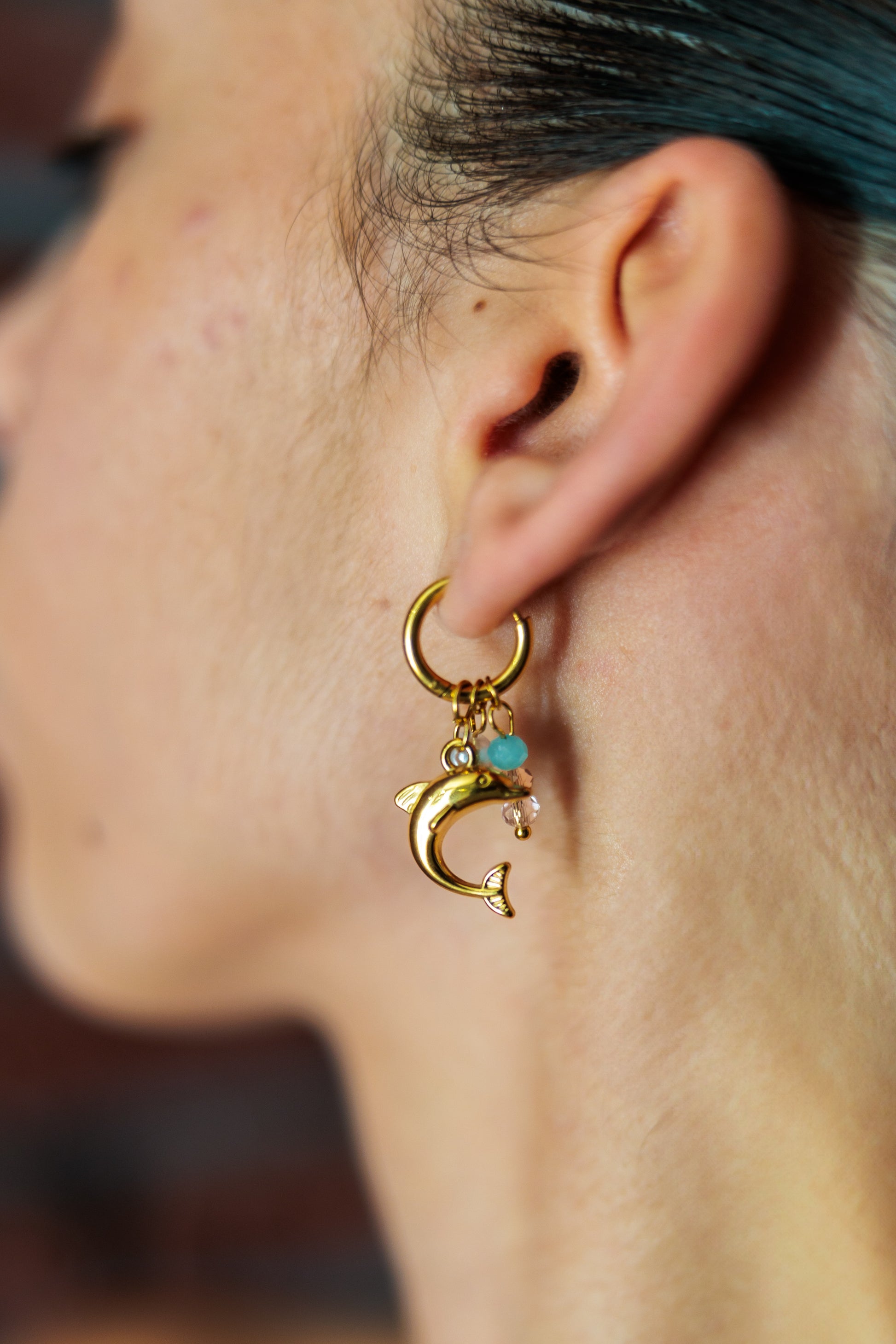 Gold Dolphin Hoop Earrings with Pastel Beads & Pearls