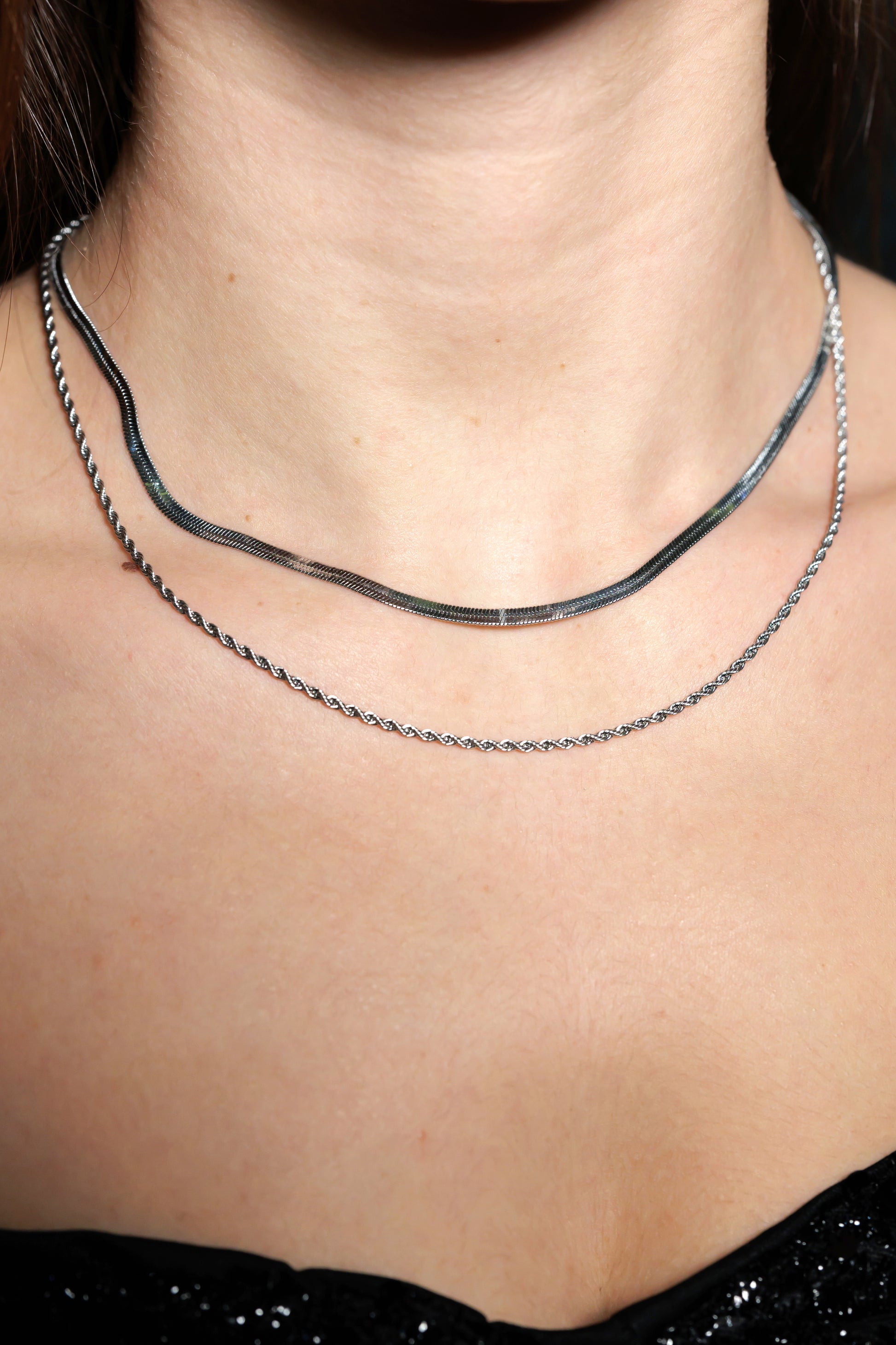 A sleek double-layer necklace featuring a flat blade snake chain design in polished stainless steel. Simple yet stylish, this versatile piece adds a modern touch to any outfit — perfect for layering or wearing on its own for an effortlessly chic look.