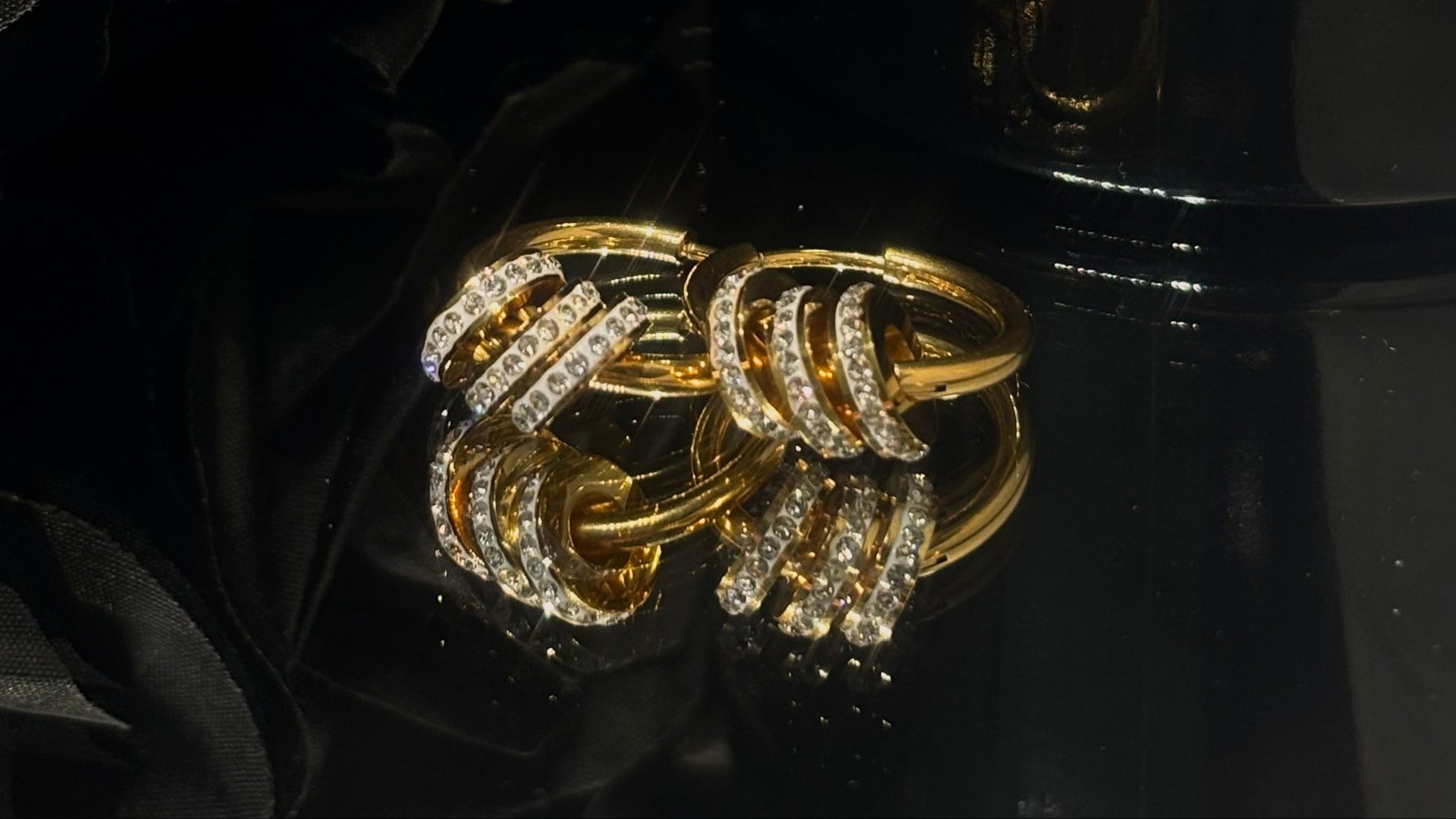 These stainless steel earrings feature a gold-plated design and are waterproof. The set includes three circles adorned with cubic zirconia and features a round drop design.