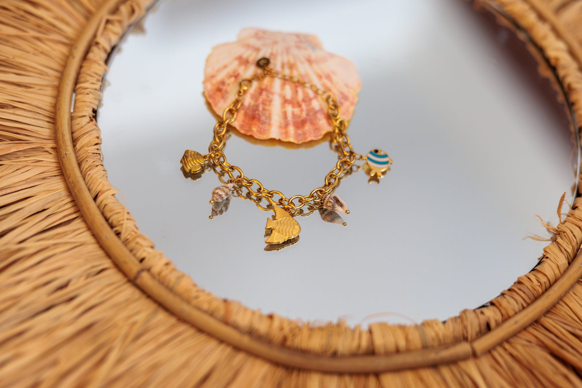 Gold-plated chain bracelet with playful ocean charms — shells, fish, and textured coins. A fun, beachy accent for an effortless summer vibe.